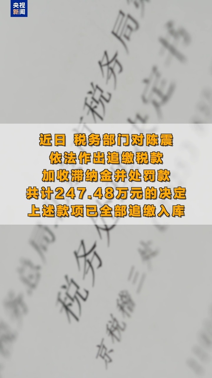 近日,税务部门对陈震依法作出追缴税款、加收滞纳金并处罚款共计247.48万元的决定,上述款项已全部追缴入库。